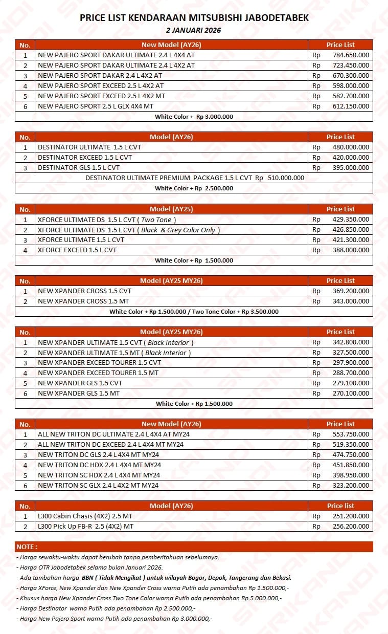 Dapatkan informasi harga terbaru dari Mitsubishi Depok Margonda meliputi Mitsubishi Destinator, Xforce, Pajero Sport, Eclipse Cross, Xpander Cross, Xpander, Triton, L300, Outlander PHEV dan Colt Diesel, Mitsubishi Fuso di daerah Depok, Cibinong, Bogor serta Jabodetabek