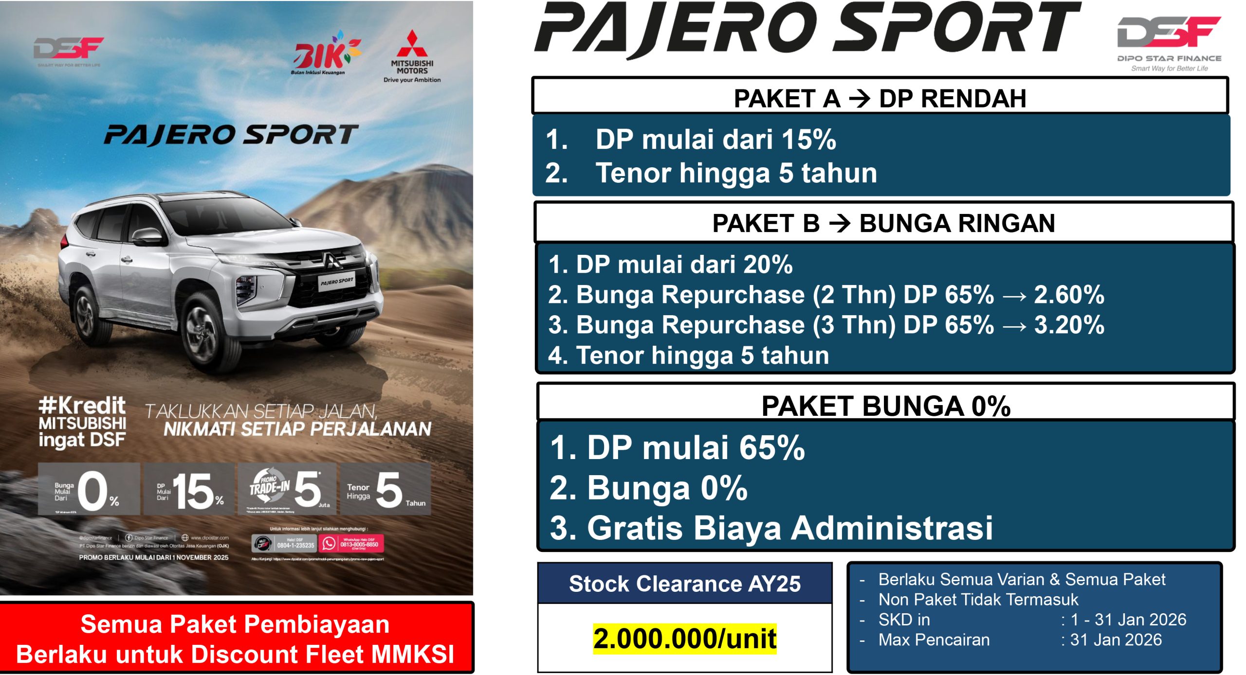 | New Pajero Sport Dakar Ultimate 2.4 L 4×2 AT | Rp 723.450.000 |